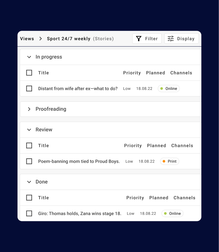 One plan for all contributors. Keep every variant of a story—print, digital, audio, or video—connected to the same story plan. When priorities change, updates flow to contributors automatically.