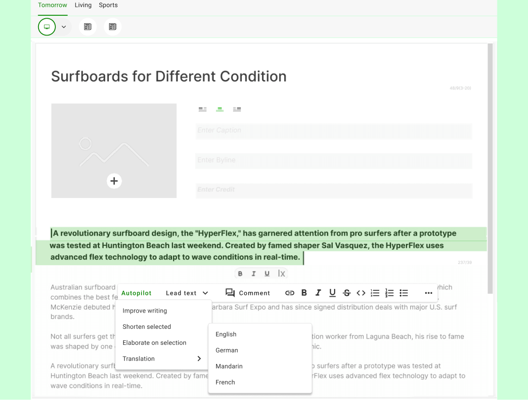 Create once. Publish everywhere. Cue can be configured to create automated variants of every story for print, digital, social, audio, and video—without having to manually start from scratch. One idea becomes many tailored to the chosen outputs.