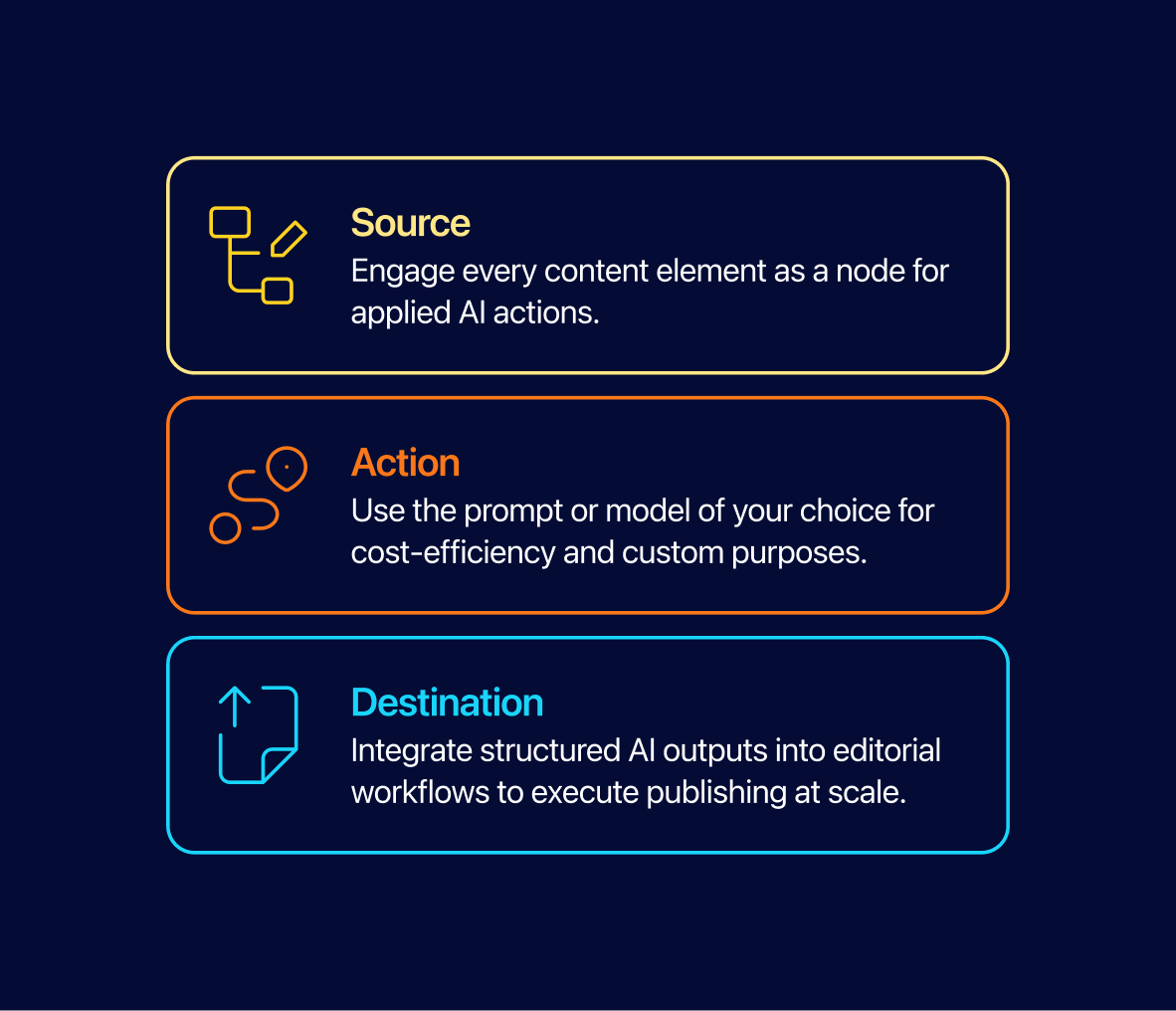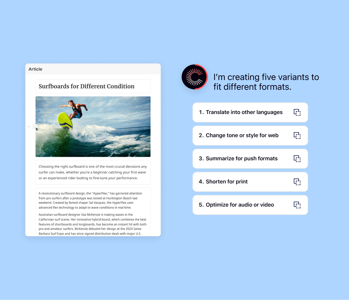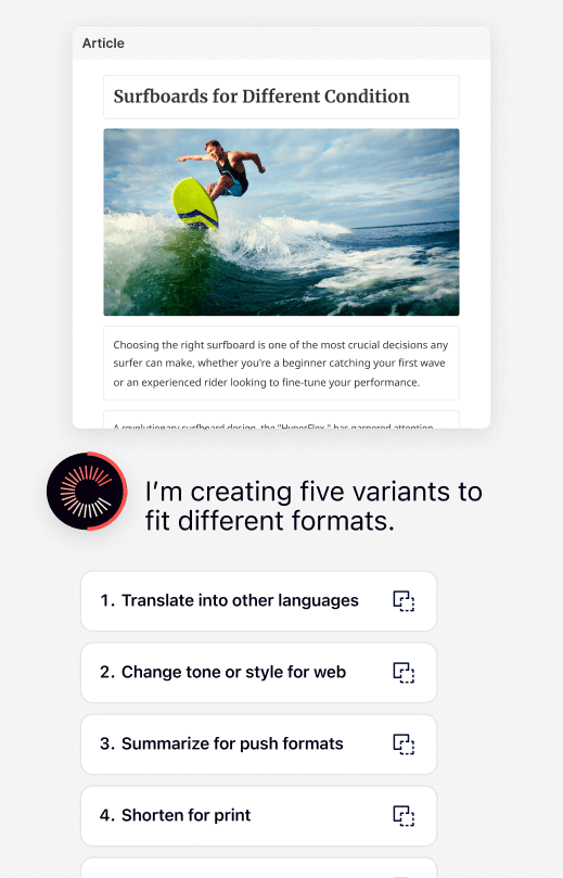 Expand reach with AI orchestrated multichannel delivery. Quickly produce multiple content variants from a single source of truth. Ideal for repurposing across channels and brands without duplicating effort, while ensuring content meets editorial standards.