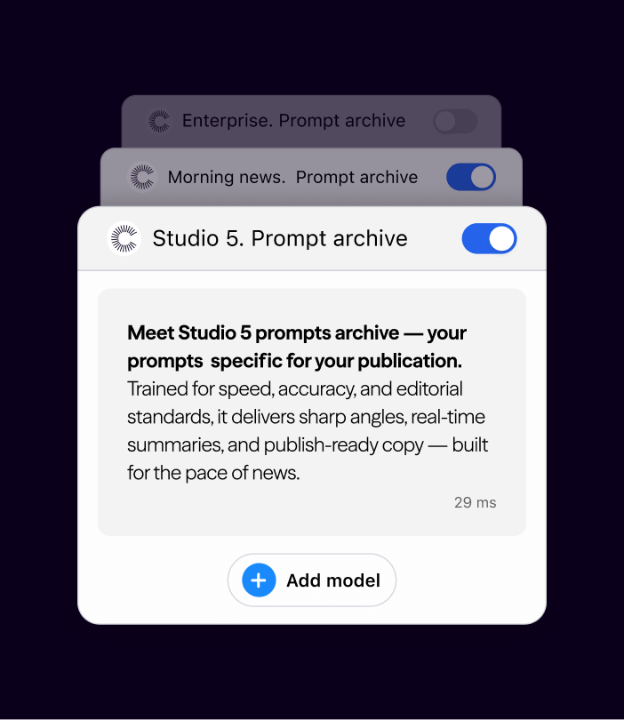 Configure AI to match editorial standards, fine-tune tone and style, and adapt workflows in real time. Align automation with your brand voice and content types, and empower your teams to focus on high-impact journalism.