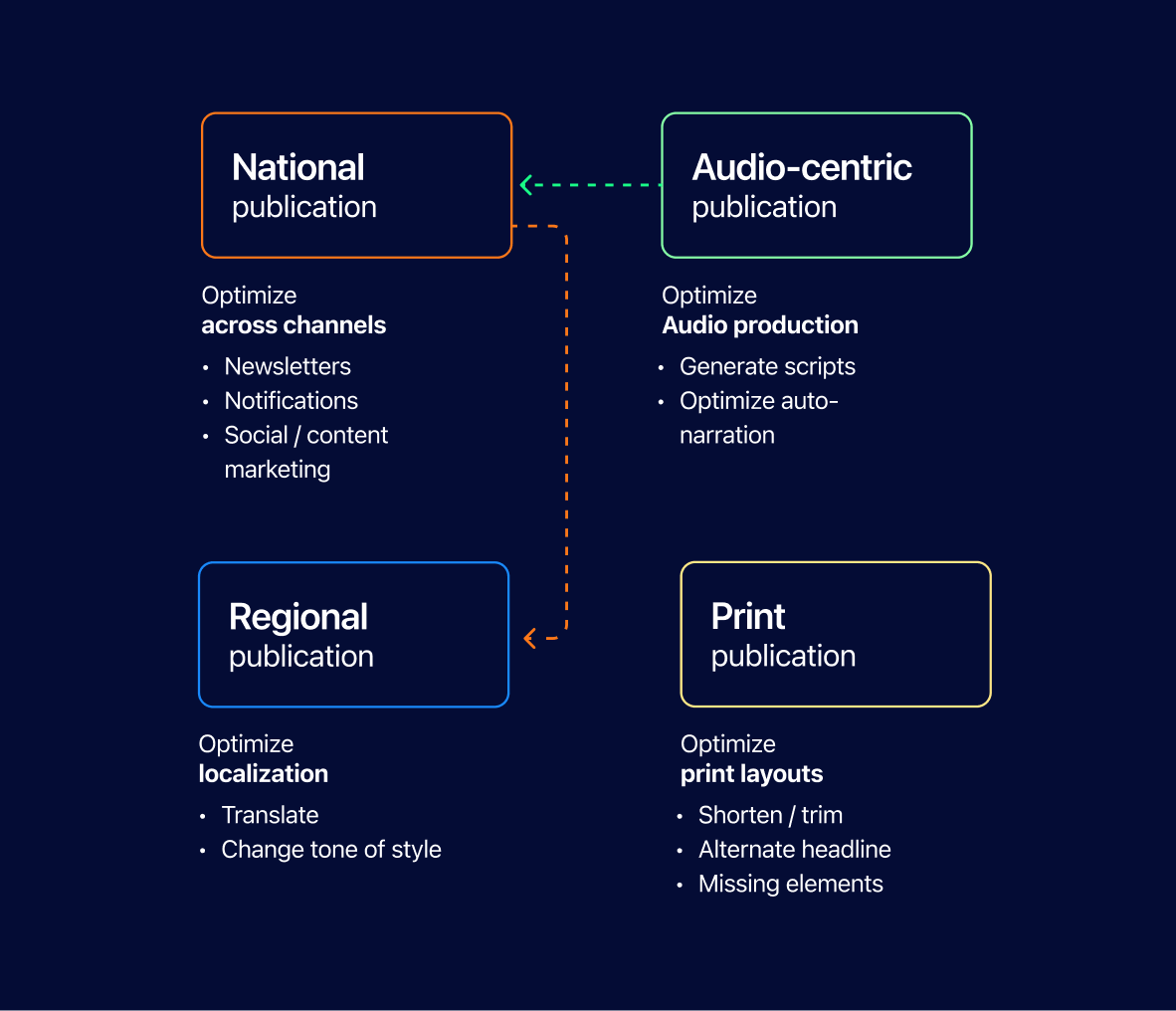 Optimize AI for each publication. Align AI-driven content workflows across the organization to reduce workflow fragmentation, turning up time-to-publish.