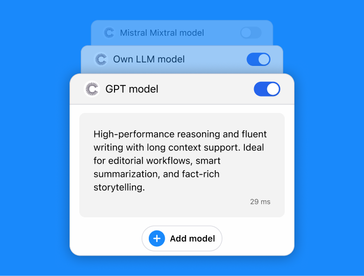 Platform extensibility. Integrate your own custom LLMs or third-party services into Cue Autopilot to match organizational preferences, policies, or innovation goals. One centralized place for integration and configuration.
