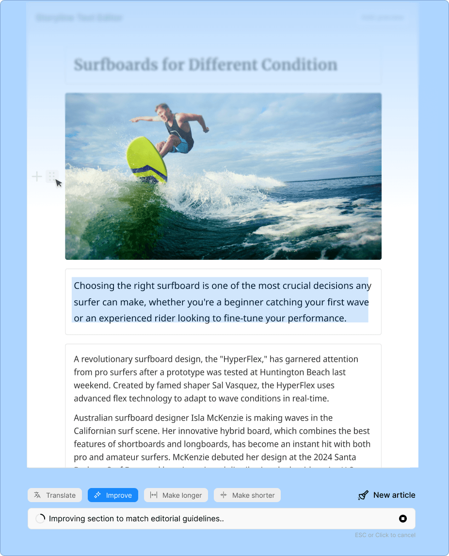 Produce variants across channels automatically.Tailor stories to fit the unique requirements of each distribution endpoint. Adjust tone, formatting, and structure for web, social, apps, and beyond.