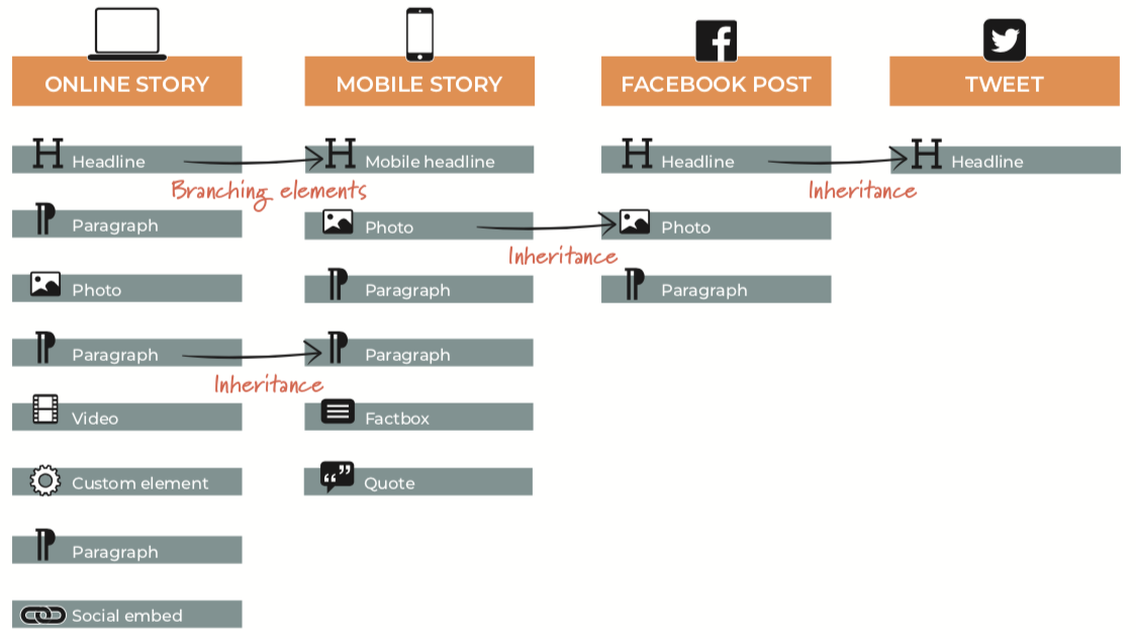 The basic concept behind Cue is that every story can be broken into smaller story elements. These elements can be mixed and matched, just like building bricks. By working with content as a collection of small, individual elements rather than big, fixed entities, content creators are able to manage different storylines from the same set of elements. This allows them to have different variants of the same story for different formats and channels.